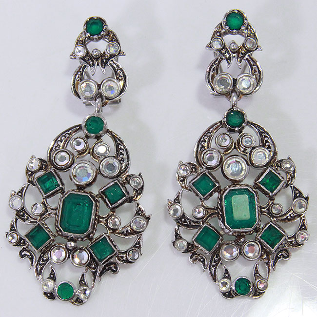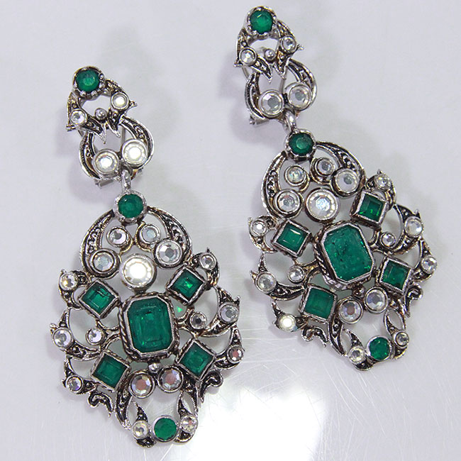 Pendientes realizados a mano en plata bañada en rodio. Las piedras son espejuelos e imitaciones de esmeralda. Llevan cierre omega. Consulte nuestras tarifas de alquiler de aderezos regionales.