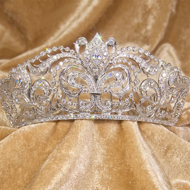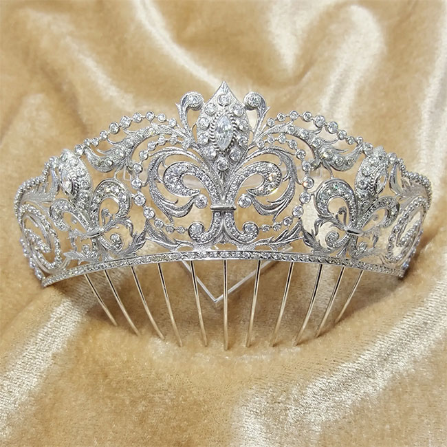 Tiara realizada en plata bañada en rodio con circonitas. Su diseño sigue las directrices de la tiara que luce la Reina Doña Sofía, creada en 1906 para la Reina Victoria Eugenia por la casa Ansorena. María Hirniak, Reina de las Fiestas de Alcora, 2017, luciendo nuestra Tiara Flor de Lis Reina Sofía.1700€