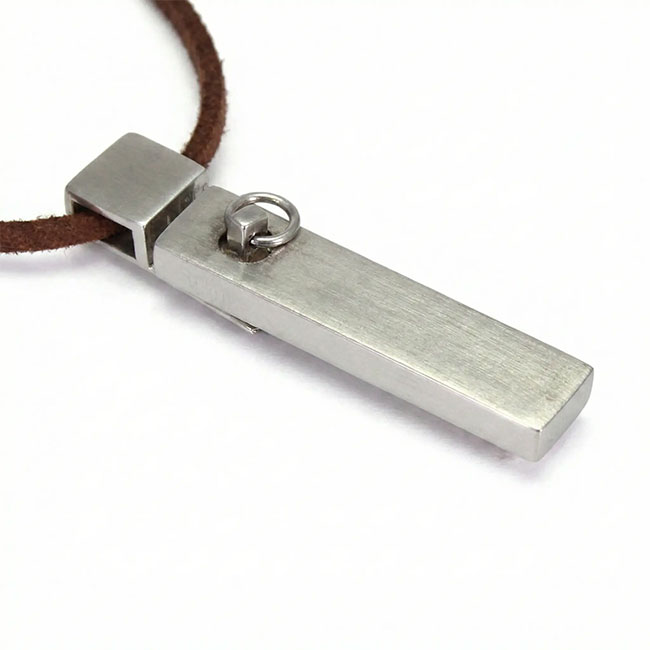 Colgante de plata de 925 mm. de original diseño. Combina el acabado en brillo en su parte superior y el mate en la inferior. Lo acompaña un cordón de cuero marrón con nudos correderos.