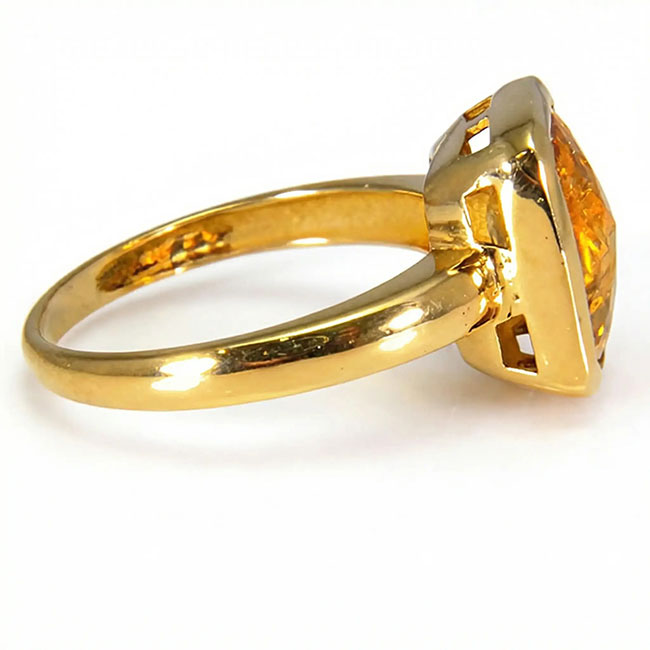 Sortija de oro amarillo de 18 quilates con una turmalina amarilla (dravita) en talla fantasía rectangular. Las medidas de la turmalina son 10x8 mm. Se puede realizar en oro blanco.